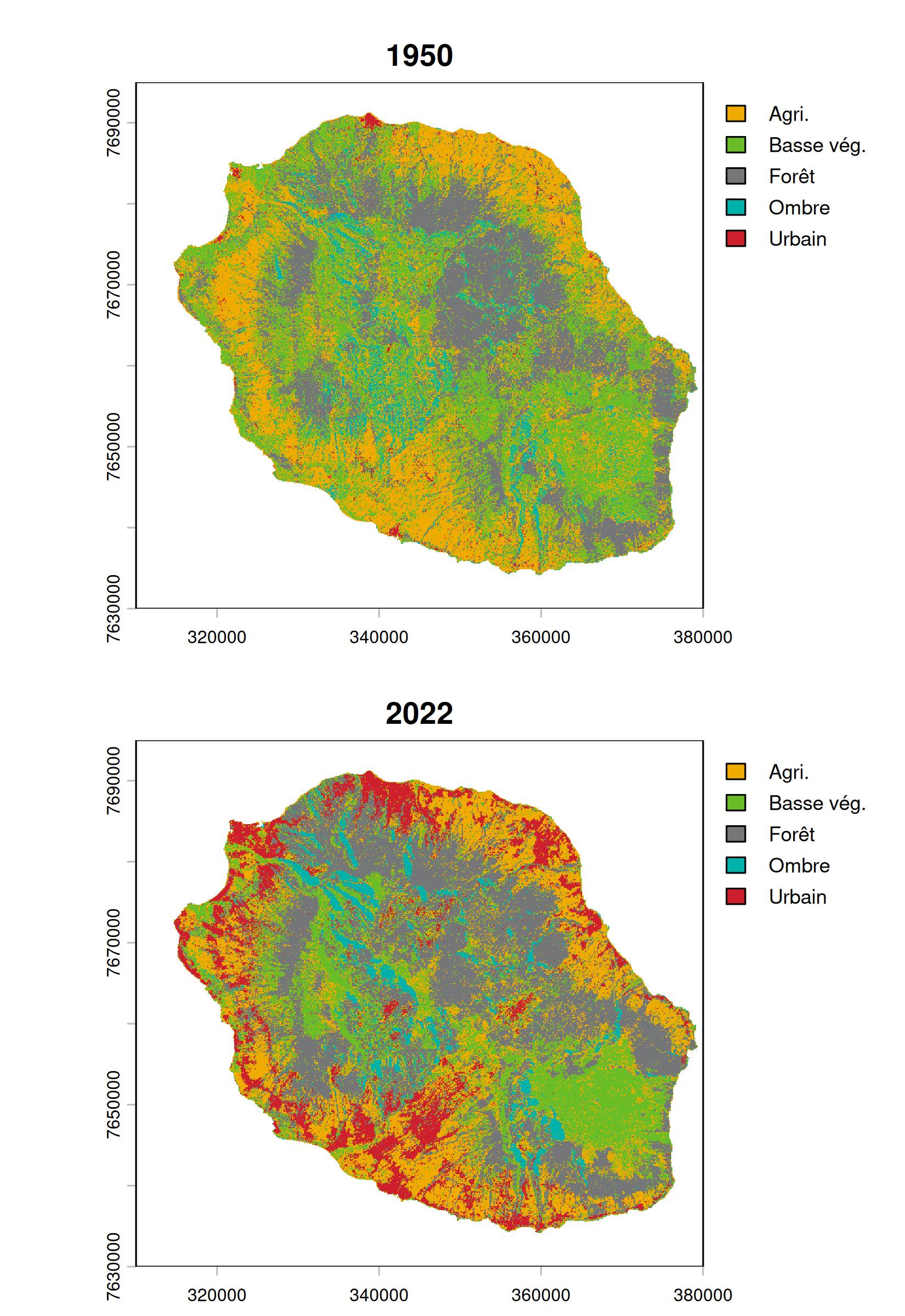 The resource provides two land cover maps of Réunion Island for the years 1950 and 2022 derived from the analysis of ortho-photographs at the island scale (Source IGN). The produced typology uses five cover classes: forest, low vegetation, agriculture, urban, and shadow (related to topography). The method used is based on encoding the two aligned rasters, converted into a single band of grayscale for 2022, using a vision-transformer deep learning model. From the features calculated for each pixel, a random forest classification model is trained separately for each year using a set of ROIs (Regions Of Interest), target polygons delineated within each of the selected classes through photo-interpretation of the original images. Model validation is performed on independent sets of polygons also defined by photo-interpretation. The maps provided in the resource are derived from the prediction of cover classes for both years using the trained and validated models. These are raw predictions, meaning that no post-processing has been applied to reduce potential noise due to classification errors. The shared resource is part of the results from the FRAG'ILE research and development program (FRAGmentation en milieu InsuLairRE, UR / CBNM/ IRD, funded by OFB, https://fragile.frama.io).